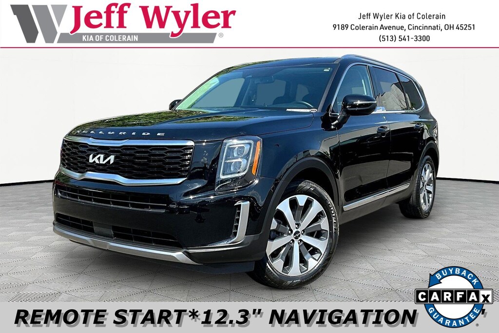 Jeff Wyler Kia of Colerain is honored to offer this outstanding 2022 Kia Telluride EX in Ebony Black. EX Premium Package (20" x 7.5" Machined Alloy Wheels, 2nd Row Captain Chairs, LED Headlamps, and Satin Chrome Roof Rails), 3.648 Axle Ratio, 3rd row seats: split-bench, 4-Wheel Disc Brakes, 6 Speakers, ABS brakes, Air Conditioning, Alloy wheels, AM/FM radio: SiriusXM, Apple CarPlay & Android Auto, Auto-dimming Rear-View mirror, Automatic temperature control, Brake assist, Bumpers: body-color, Carpeted Floor Mats, Compass, Delay-off headlights, Driver door bin, Driver vanity mirror, Dual front impact airbags, Dual front side impact airbags, Electronic Stability Control, Emergency communication system: 911 Connect, Four wheel independent suspension, Front anti-roll bar, Front Bucket Seats, Front Center Armrest, Front dual zone A/C, Front reading lights, Fully automatic headlights, Heated & Ventilated Front Bucket Seats, Heated door mirrors, Heated front seats, Illuminated entry, Knee airbag, Leather Seat Trim, Leather Shift Knob, Leather steering wheel, Low tire pressure warning, Navigation System, Occupant sensing airbag, Outside temperature display, Overhead airbag, Overhead console, Panic alarm, Passenger door bin, Passenger vanity mirror, Power door mirrors, Power driver seat, Power Liftgate, Power moonroof, Power passenger seat, Power steering, Power windows, Radio data system, Radio: AM/FM Display Audio System, Rear air conditioning, Rear anti-roll bar, Rear audio controls, Rear reading lights, Rear seat center armrest, Rear window defroster, Rear window wiper, Reclining 3rd row seat, Remote keyless entry, Roof rack: rails only, Security system, Smart Key w/ Push Button and Remote Start, Speed control, Speed-sensing steering, Split folding rear seat, Spoiler, Steering wheel mounted audio controls, Tachometer, Telescoping steering wheel, Tilt steering wheel, Traction control, Trip computer, Turn signal indicator mirrors, Variably intermittent wipers, Ventilated front seats, and Wheels: 18" x 7.5" Machined Alloy Our PRE-OWNED vehicles are put through a rigorous 167- POINT QUALITY ASSURANCE INSPECTION along with an average amount of over $1,400.00 SPENT to recondition each vehicle so we can be sure to deliver you the highest quality vehicle like you deserve! ***ONLINE PRICE DOES NOT INCLUDE WYLER FAMILY FIRST PACKAGE***