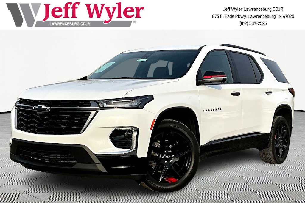 Jeff Wyler Chrysler Dodge Jeep of Lawrenceburg is excited to offer this wonderful 2023 Chevrolet Traverse Premier in Summit White. Preferred Equipment Group 1LZ (Heated 2nd Row Outboard Position Seats, Heated Driver & Front Passenger Seats, and Ventilated Driver & Front Passenger Seats), Redline Edition (Black Bowtie, Black Door Handles, Black Roof Rails, Dual SkyScape 2-Panel Power Sunroof, Ornamentation, Redline Accent Decals (LPO), and Wheels: 20" Gloss Black Painted Alum w/Red Stripes), AWD, 10 Speakers, 3.49 Axle Ratio, 3rd row seats: split-bench, 4-Wheel Disc Brakes, 6-Way Power Front Passenger Seat, 8-Way Power Driver Seat Adjuster, ABS brakes, Air Conditioning, Alloy wheels, AM/FM radio: SiriusXM with 360L, Apple CarPlay/Android Auto, Auto High-beam Headlights, Auto-dimming door mirrors, Auto-dimming Rear-View mirror, Automatic temperature control, Bose Premium 10-Speaker Audio System Feature, Brake assist, Bumpers: body-color, Compass, Delay-off headlights, Driver door bin, Driver vanity mirror, Dual front impact airbags, Dual front side impact airbags, Electronic Stability Control, Emergency communication system, Exterior Parking Camera Rear, Four wheel independent suspension, Front anti-roll bar, Front Bucket Seats, Front Center Armrest, Front dual zone A/C, Front Passenger 2-Way Power Lumbar, Front reading lights, Fully automatic headlights, Garage door transmitter, Heated door mirrors, Heated front seats, Heated rear seats, Heated steering wheel, Illuminated entry, Leather steering wheel, Low tire pressure warning, Memory seat, Navigation System, Occupant sensing airbag, Outside temperature display, Overhead airbag, Overhead console, Panic alarm, Passenger door bin, Passenger vanity mirror, Perforated Leather-Appointed Seat Trim, Power door mirrors, Power Driver Lumbar Control, Power driver seat, Power Liftgate, Power passenger seat, Power steering, Power windows, Premium audio system: Chevrolet Infotainment 3 Plus, Radio data system, Radio: Chevrolet Infotainment 3 Plus System w/Navi, Rear air conditioning, Rear anti-roll bar, Rear reading lights, Rear window defroster, Rear window wiper, Remote keyless entry, Security system, SiriusXM w/360L, Speed control, Speed-sensing steering, Spoiler, Steering wheel memory, Steering wheel mounted audio controls, Tachometer, Telescoping steering wheel, Tilt steering wheel, Traction control, Trip computer, Turn signal indicator mirrors, Variably intermittent wipers, Ventilated front seats, Voltmeter, and Wheels: 20" Metallic Machined-Face Aluminum Our PRE-OWNED vehicles are put through a rigorous 167- POINT QUALITY ASSURANCE INSPECTION along with an average amount of over $1,400.00 SPENT to recondition each vehicle so we can be sure to deliver you the highest quality vehicle like you deserve! ***ONLINE PRICE DOES NOT INCLUDE WYLER FAMILY FIRST PACKAGE*** Stop by 4136 Shelbyville Road to see for yourself, or give us a call @ 502-897-3151 to schedule your test drive! Ask about available certifications.