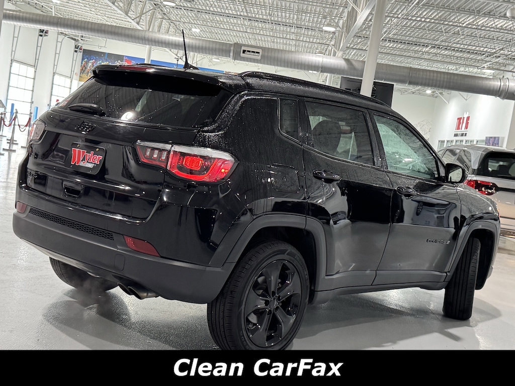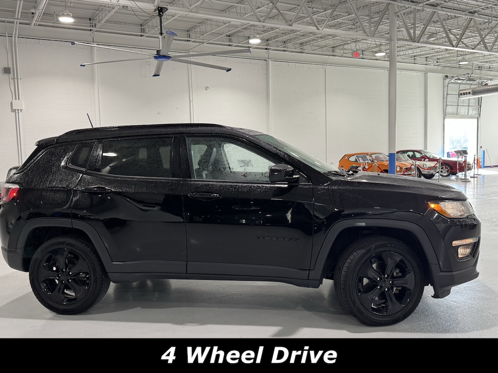 4WD/AWD, Bluetooth, Push Button Start, Backup Camera, CLEAN CARFAX, 4WD, 115V Auxiliary Power Outlet, 3.73 Axle Ratio, 4-Way Power Lumbar Adjust, 4-Wheel Disc Brakes, 6 Speakers, ABS brakes, Air Conditioning, All-Season Floor Mats, Alloy wheels, Altitude Special Edition, AM/FM radio: SiriusXM, Anti-whiplash front head restraints, Apple CarPlay/Android Auto, Auto-Dimming Rear-View Mirror, Automatic temperature control, Black 4x4 Tailgate Badge, Black Day Light Opening Moldings, Black Grille w/Black Rings, Black Roof, Brake assist, Bright Exhaust Tip, Bumpers: body-color, Cluster 7.0" Color Driver Info Display, Compass, Convenience Group, Delay-off headlights, Driver door bin, Driver vanity mirror, Dual front impact airbags, Dual front side impact airbags, Electronic Stability Control, Four wheel independent suspension, Front anti-roll bar, Front Bucket Seats, Front Center Armrest w/Storage, Front dual zone A/C, Front fog lights, Front reading lights, Fully automatic headlights, Gloss Black Compass Badge, Gloss Black Fog Lamp Bezels, Gloss Black Jeep Badge, Gloss Black Lower Rear Fascia Valance, Heated door mirrors, Heated Front Seats, Heated Steering Wheel, Illuminated entry, Knee airbag, Low tire pressure warning, Occupant sensing airbag, Outside temperature display, Overhead airbag, Overhead console, Panic alarm, ParkView Rear Back-Up Camera, Passenger door bin, Passenger vanity mirror, Piano Black Interior Accents, Power 8-Way Driver/Manual 6-Way Pass Seat, Power door mirrors, Power steering, Power windows, Premium Cloth/Vinyl Bucket Seats, Quick Order Package 2GB Altitude, Radio: Uconnect 4 w/7" Display, Rear anti-roll bar, Rear seat center armrest, Rear window defroster, Rear window wiper, Remote keyless entry, Remote Start System, Reversible Carpet/Vinyl Cargo Mat, Roof rack: rails only, Speed control, Split folding rear seat, Spoiler, Steering wheel mounted audio controls, Tachometer, Telescoping steering wheel, Tilt steering wheel, Traction control, Trip computer, Variably intermittent wipers, Wheels: 17" x 7.0" Silver Painted Aluminum, Wheels: 18" x 7.0" Black Aluminum, Windshield Wiper De-Icer. Clean CARFAX. 4WD 9-Speed 948TE Automatic 2.4L I4Recent Arrival!22/30 City/Highway MPGAsk about available certifications.