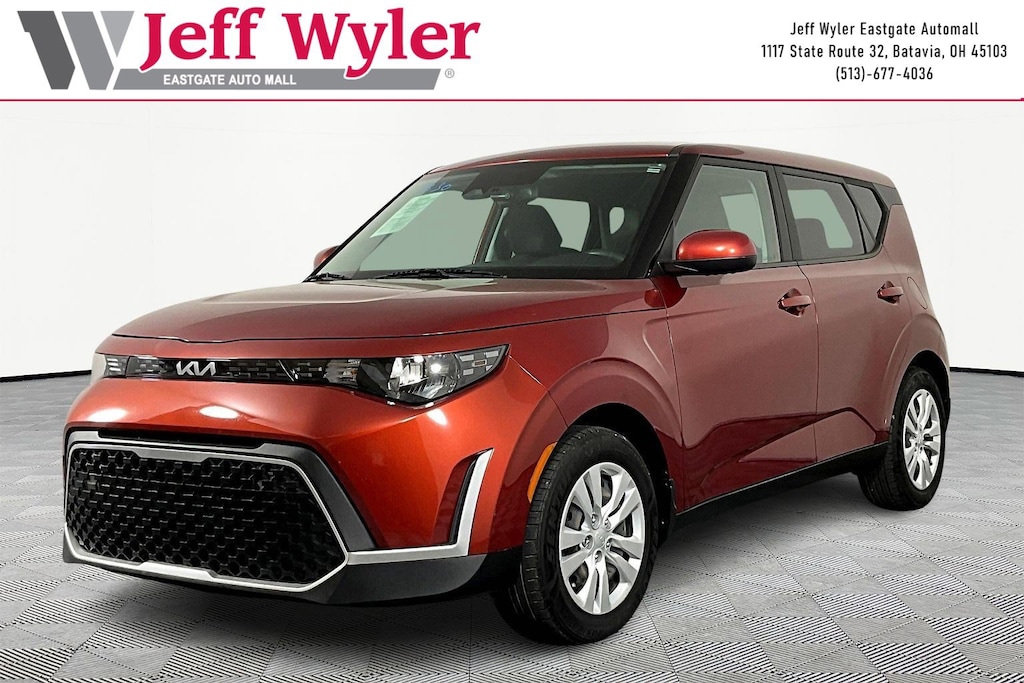 Jeff Wyler Eastgate Auto Mall is excited to offer this handsome 2023 Kia Soul LX in Mars Orange. Well equipped with: 16" Alloy Wheels, 16" Steel Wheels, 4-Wheel Disc Brakes, 6 Speakers, ABS brakes, Air Conditioning, AM/FM radio, Apple CarPlay & Android Auto, Auto High-beam Headlights, Brake assist, Bumpers: body-color, Carpeted Floor Mats, Compass, Delay-off headlights, Driver door bin, Driver vanity mirror, Dual front impact airbags, Dual front side impact airbags, Electronic Stability Control, Exterior Parking Camera Rear, Front anti-roll bar, Front Bucket Seats, Front Center Armrest, Front reading lights, Front wheel independent suspension, Fully automatic headlights, Illuminated entry, Low tire pressure warning, Occupant sensing airbag, Outside temperature display, Overhead airbag, Overhead console, Panic alarm, Passenger door bin, Passenger vanity mirror, Power door mirrors, Power steering, Power windows, Radio data system, Radio: AM/FM/MP3/HD Audio System, Rear window defroster, Rear window wiper, Remote keyless entry, Speed control, Speed-sensing steering, Split folding rear seat, Steering wheel mounted audio controls, Tachometer, Telescoping steering wheel, Tilt steering wheel, Traction control, Trip computer, Variably intermittent wipers, and Woven & Tricot Cloth Seat Trim. CARFAX One-Owner. Clean CARFAX. Ask about available certifications. Used vehicles 10 years of age or newer with less than 100,000 miles are eligible for the Wyler Assurance Program, but eligible vehicles must pass our reconditioning process and multi-point inspection. Provided the vehicle passes inspection, vehicles will be eligible for the 6 month/6,000 mile limited warranty. The 6 month/6,000 mile limited warranty is NOT available on AS-IS vehicles, wholesale vehicles, lease buyback/pass-thru vehicles or un-inspected vehicles. Note that this program can also apply to vehicles where the remaining factory coverage is less than 6 months or 6,000 miles. Please check the Federal Trade Commission (FTC) Buyers guide on the vehicle for full details as to whether or not warranty coverage may apply. Contact Dealer for additional details. The Wyler Assurance 6 month/6,000 Mile limited warranty ends 6 months from the date of the Retail Purchase Agreement (BUYERS ORDER) or when the vehicle's odometer registers 6,000 additional miles to the mileage listed on the BUYERS ORDER, whichever comes first. Your Deductible - The warranty holder on your contract pays the first $100 of each covered repair.